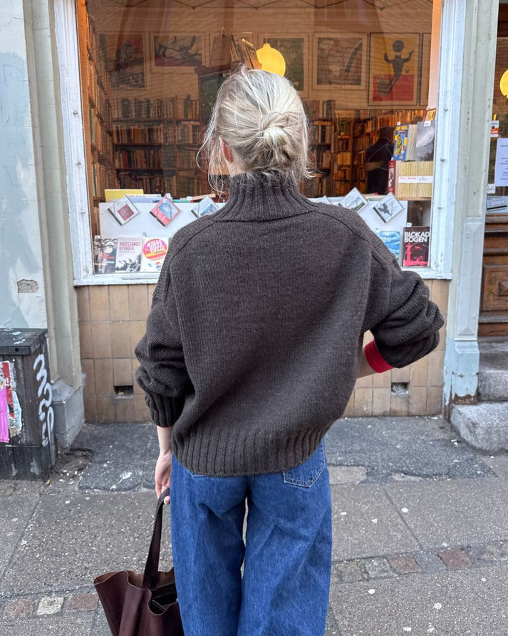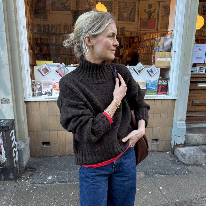 The Hannah Sweater O-neck is worked from the top down. First, the back yoke is worked back and forth on the needle with increases. The shoulders and then the front yoke is worked from stitches that are picked up and knitted along the back yoke. The sleeves are worked from stitches that are picked up and knitted along the armhole openings. At the end, stitches are picked up and knitted along the neck opening, and a double rib edge is worked.